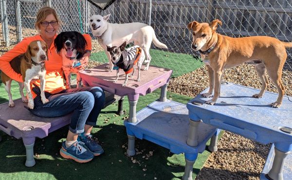 Traditional daycare at JDPC is structured into play times and rest times. Dogs in groups of 6-10 (depending on size and rowdiness!) get to run, chase, and play in our indoor and outdoor play yards, having fun on agility obstacles and playing with toys – plus getting lots of love from all the humans in the building!